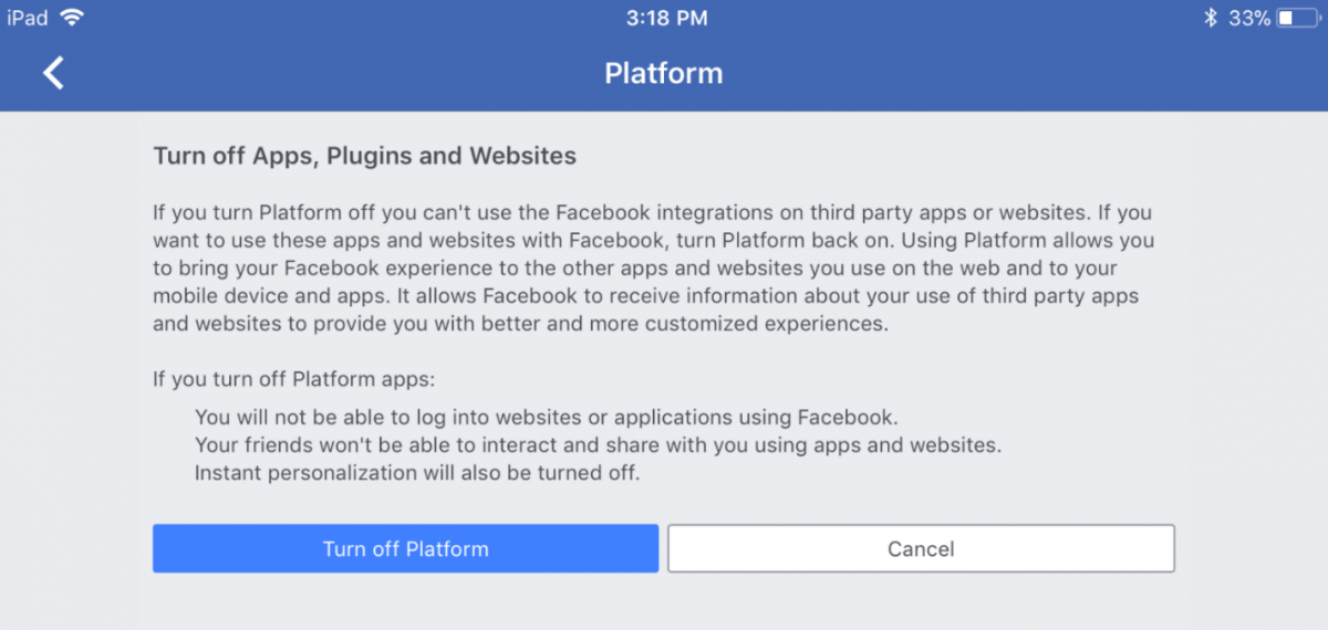 Facebook has declared some types of information, including users’ name and profile picture, “publicly available” — and has made all of that information available to each user’s friends’ apps as well. The only way to prevent this data sharing is to exercise the “nuclear option” of turning off all app functionality. As a stern warning from Facebook explains, this prevents you from using Facebook for a whole list of purposes, including logging into other websites or applications.