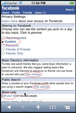 The privacy settings on the mobile page are a definite improvement, and a pleasant surprise given the limited real estate available on mobile devices. Rather than deemphasizing directory information, block lists, and the ability to customize settings, all of these are prominent links right in front of the mobile user.