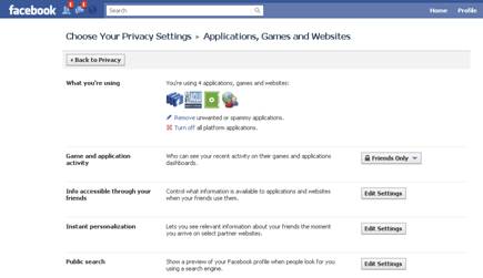 On the main Facebook site, users can access the following page with several different privacy settings, including an option to opt out of instant personalization and controls that determine whether web sites and apps can access a user's information if her friend visits the site or runs the app.