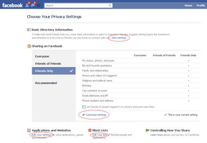 Compare that with the main privacy page on the web site, where "Sharing on Facebook" dominates the page and the "customize" link and remaining settings are easy to miss: