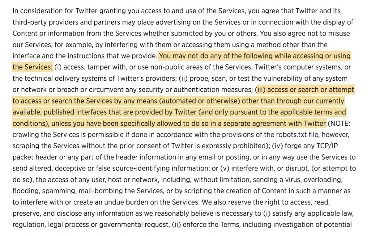 Because Geofeedia obtained this access to Twitter, Facebook and Instagram as a developer, it could access a flow of data that would otherwise require an individual to “scrape” user data off of the services in an automated fashion that is prohibited by the terms of service (here and here). With this special access, Geofeedia could quickly access public user content and make it available to the 500 law enforcement and public safety clients claimed by the company.